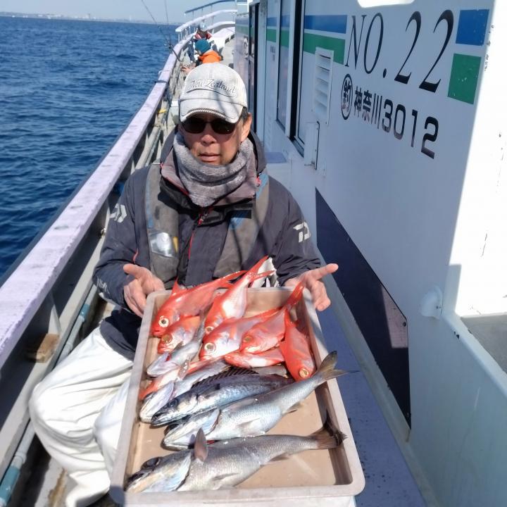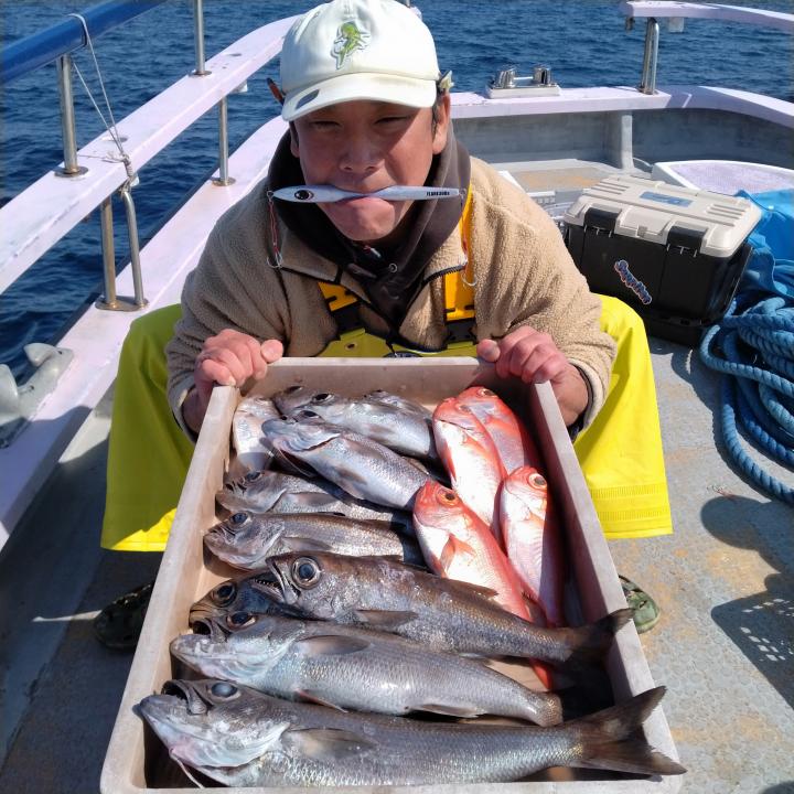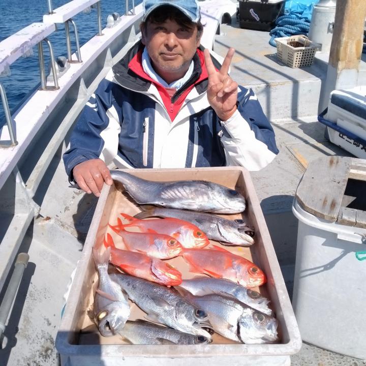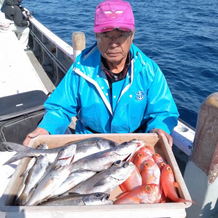 ベタ凪で程良く潮流れ、終日飽きない程度にアタリあり、キンメ·クロムツ·メダイ·シロムツ、サバ等釣れ、皆様お土産になって良かったです。